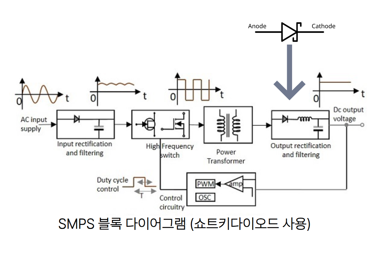 - 정류기: 일반 다이오드 대비 전력 손실 30~40% 감소